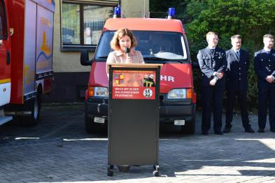 Für die Verbandsgemeinde Diez sprach Bürgermeisterin Maren Busch ein Grußwort und bekräftigte dabei, dass mit dem neuen TSF-W die Rahmenbedingungen für die ehrenamtliche Hilfestellung der Feuerwehr einmal mehr deutlich verbessert wurde. Sie sei sicher, dass auf diese Weise dazu beitragen wurde, dass die aktiven Mitglieder der Wehr weiterhin motiviert einem „so großartigen Hobby, einem so wichtigen Ehrenamt die Treue halten, damit die Verbandsgemeinde ihre Pflichtaufgaben im Brandschutz auch langfristig erfüllen kann!“