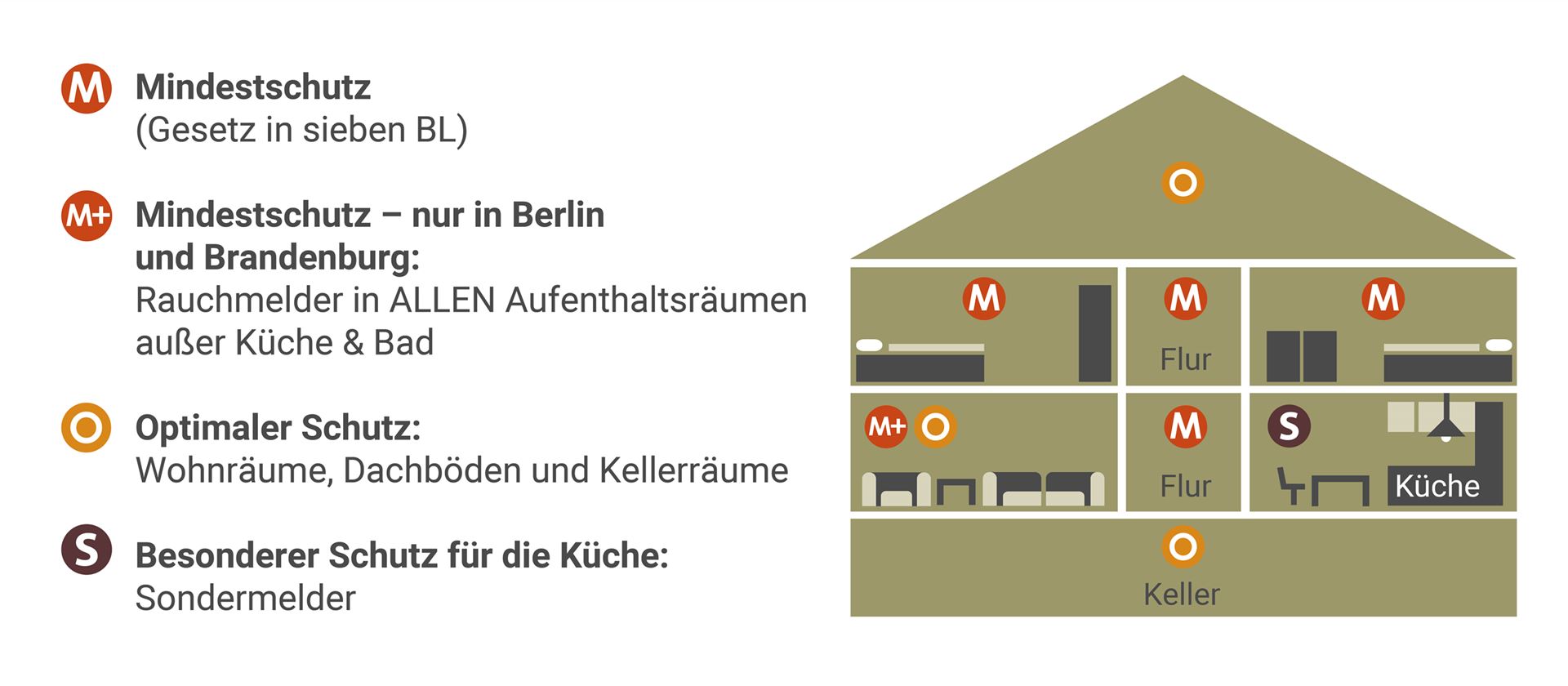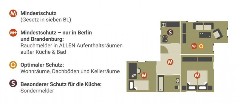In der Landesbauordnung des jeweiligen Bundeslandes finden Sie die Angabe, in welchen Räumen Rauchmelder installiert werden sollen. Grundsätzlich gilt, dass in jedem Schlafzimmer, Kinderzimmer und in Fluren, die als Fluchtwege dienen, Rauchmelder installiert werden sollen. Außer in Berlin und Brandenburg. Hier regelt die Rauchmelderpflicht, dass auch im Wohnzimmer ein Rauchmelder installiert werden soll.