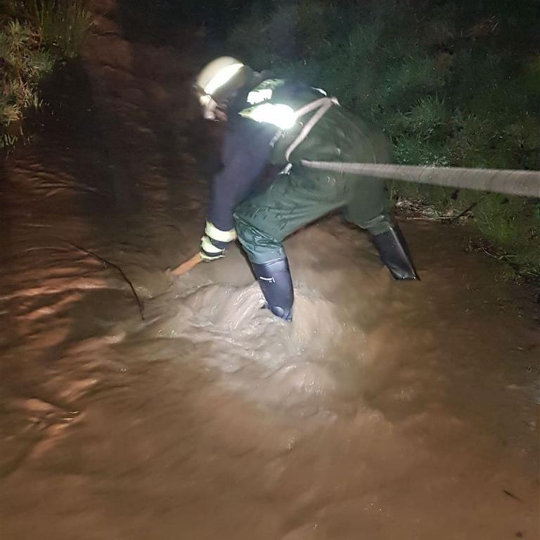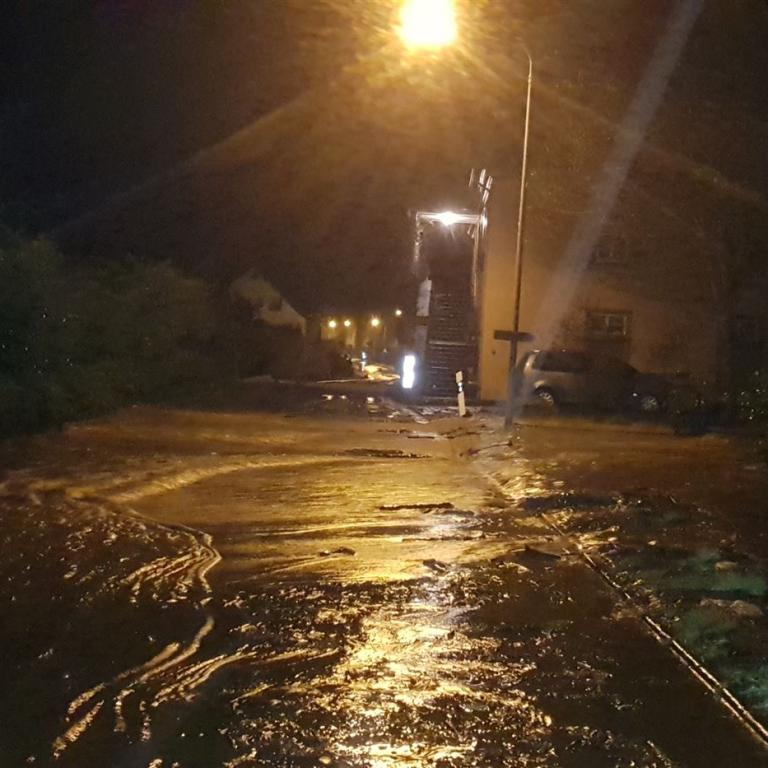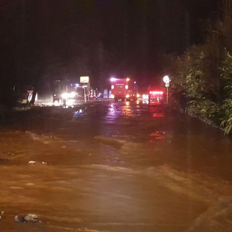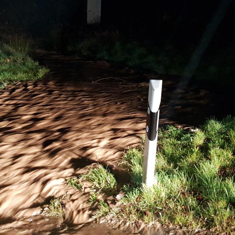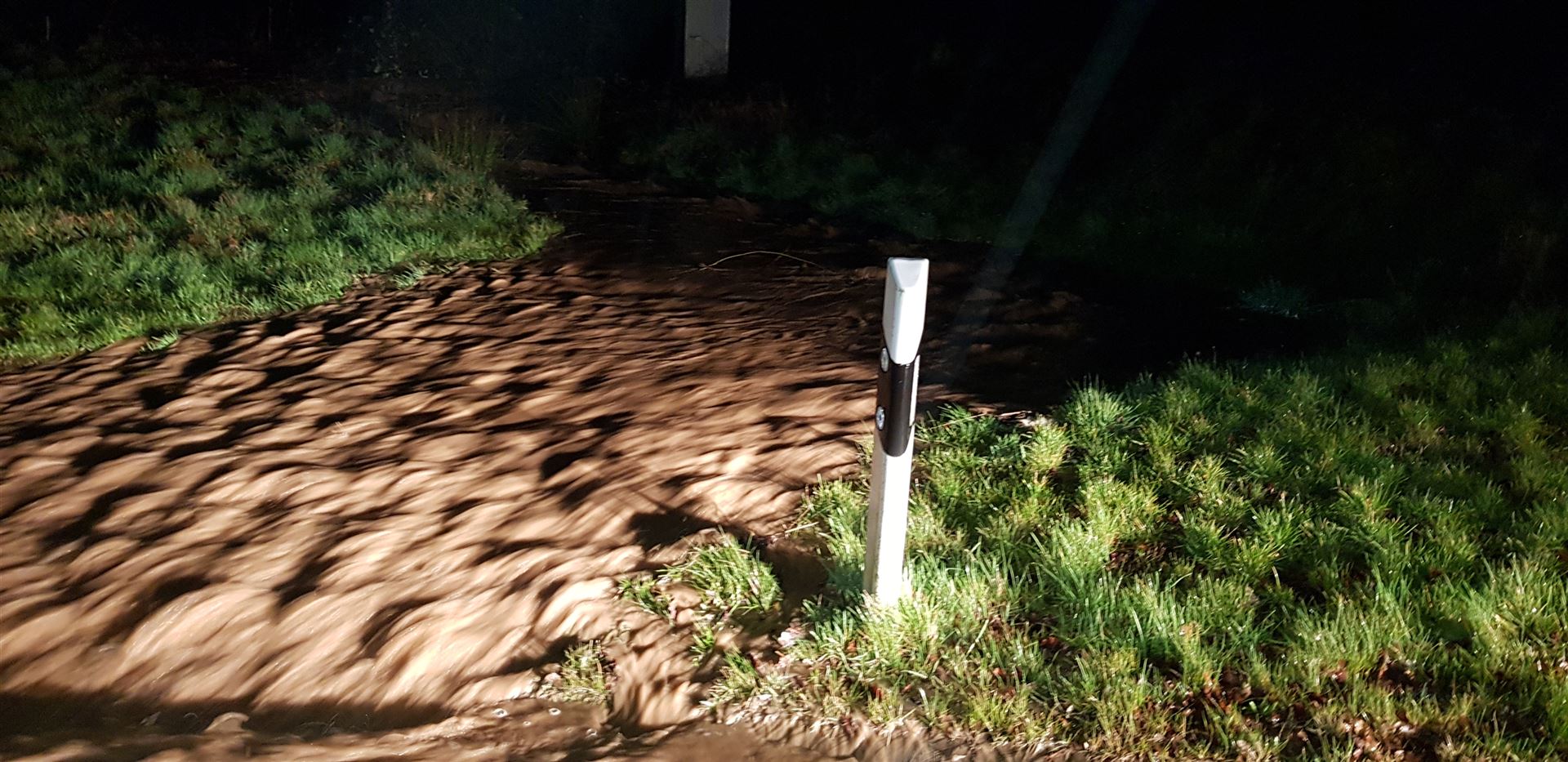 Die starken Regenfälle des heutigen Tages hatten einen Kanaleinlauf zugesetzt. Dieser wurde gereinigt und die Straße von grobem Dreck befreit.