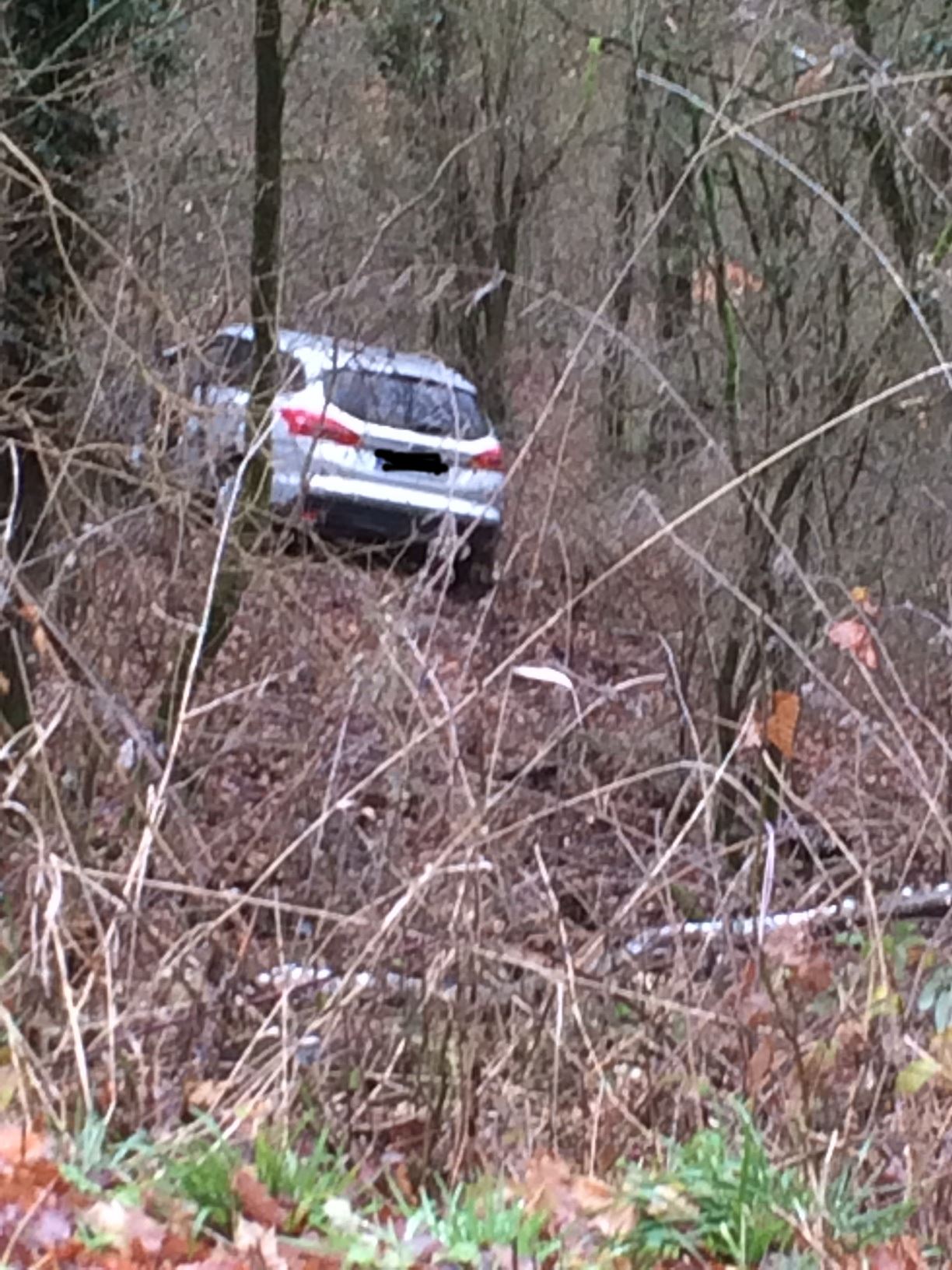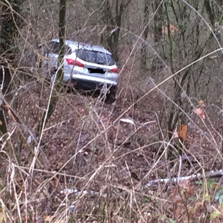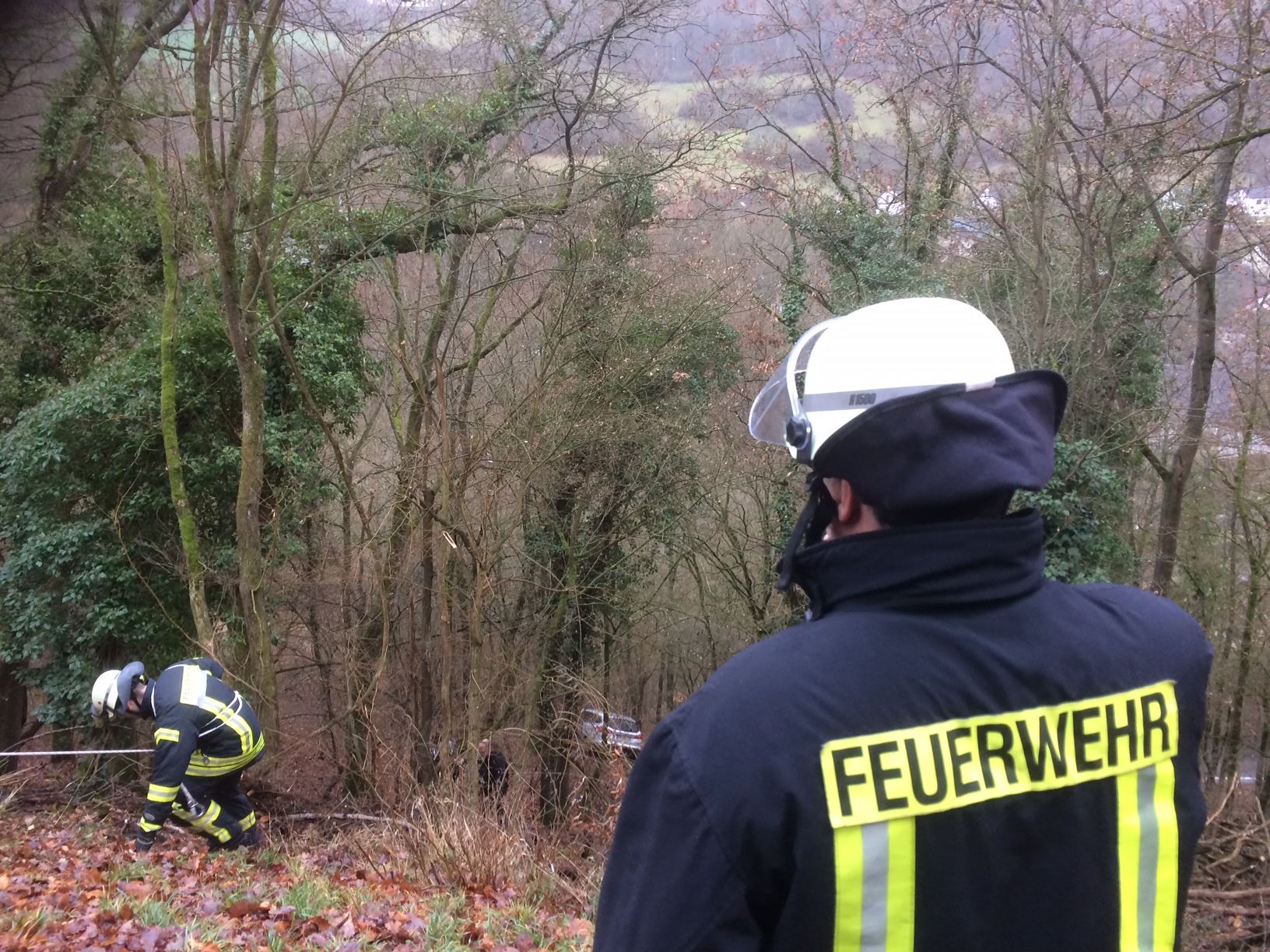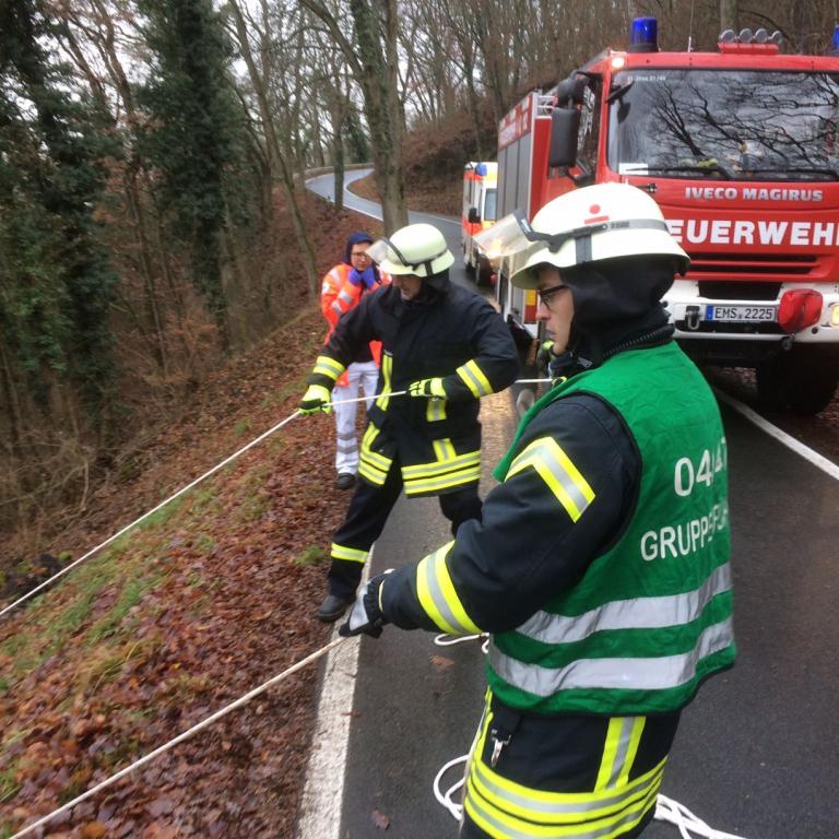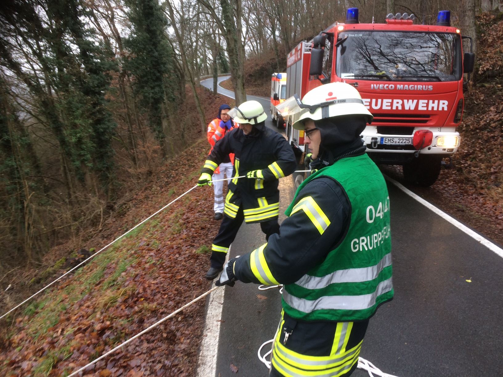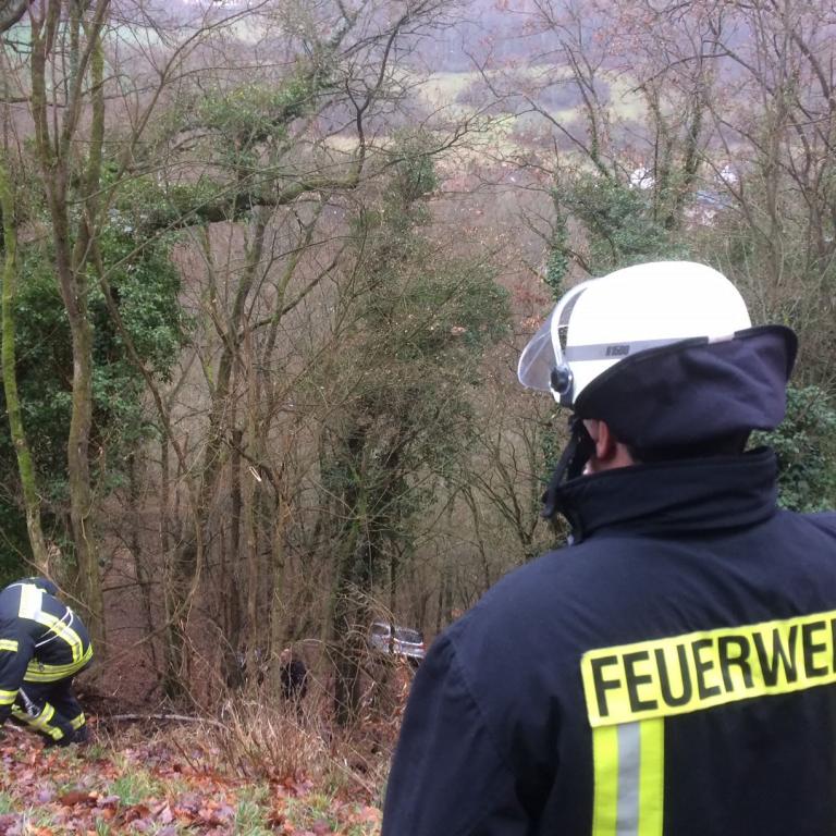 Ein PKW war rechtsseitig auf der K32 einen Abhang hinunter gerutscht und hatte sich nach ca. 30 m zwischen Bäumen verkeilt.