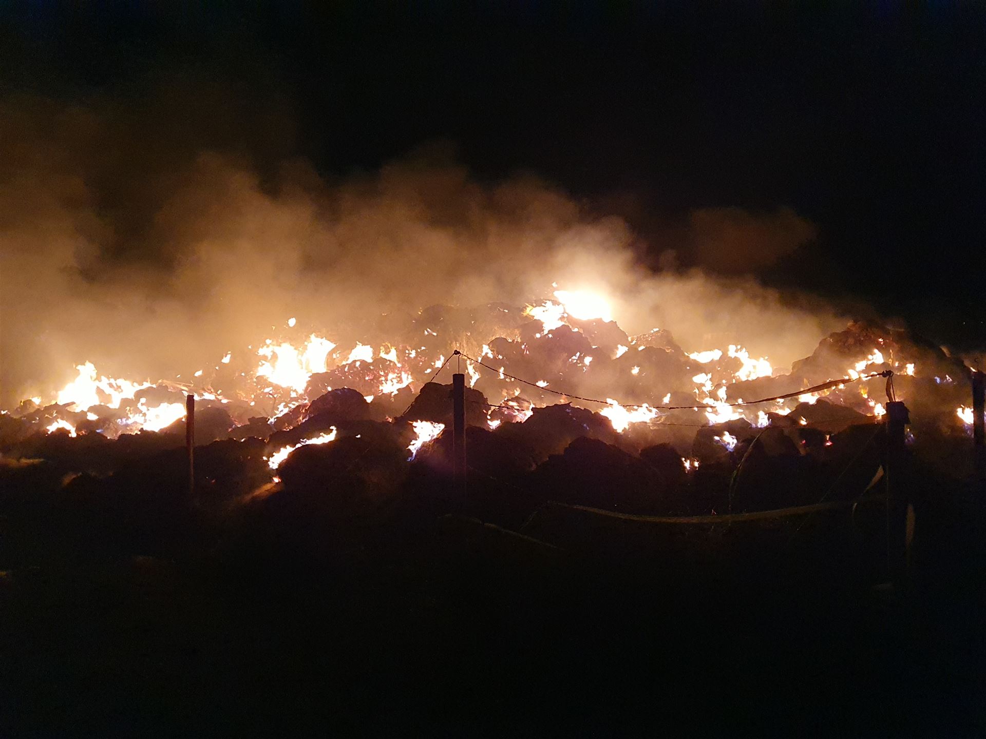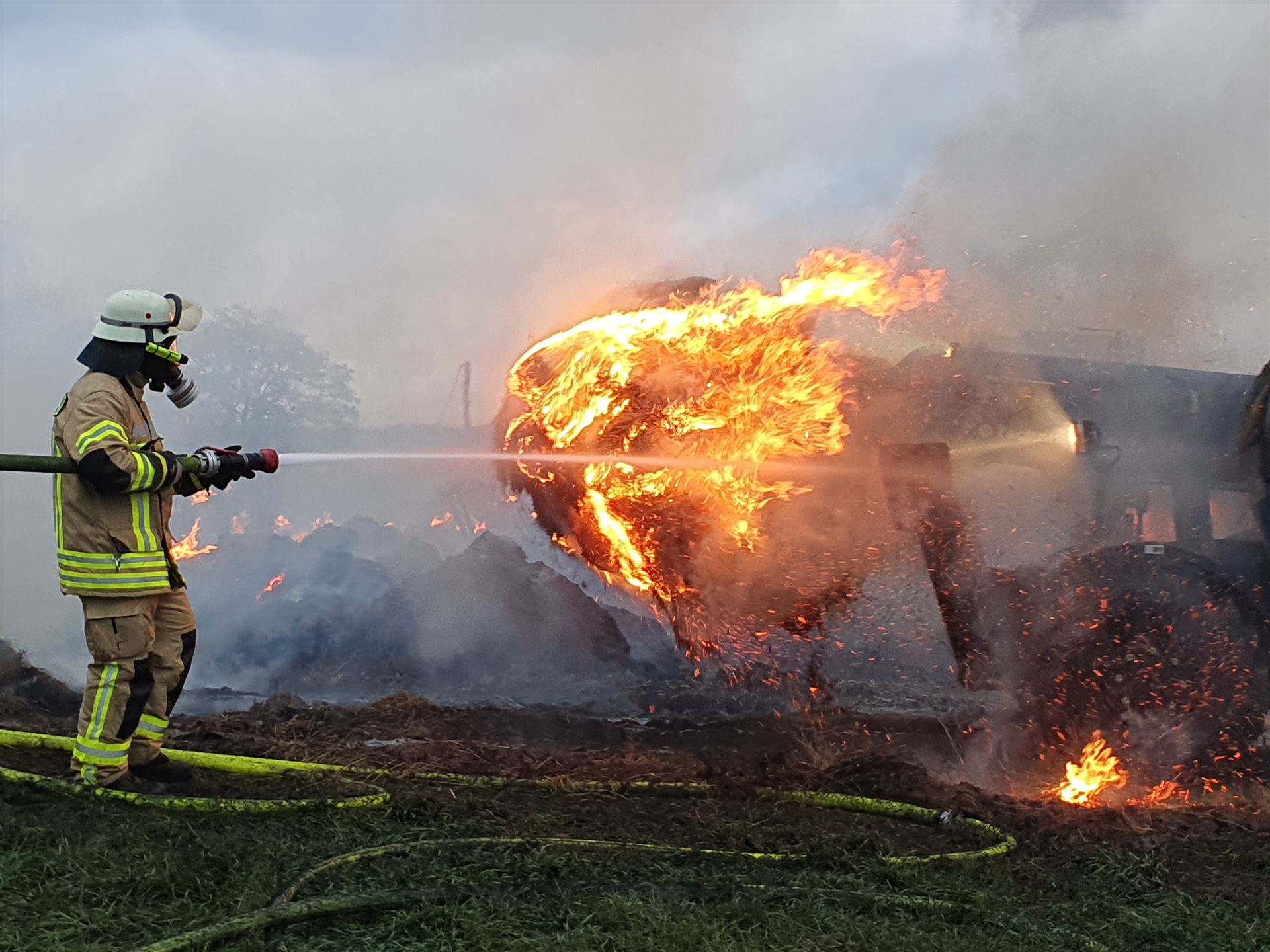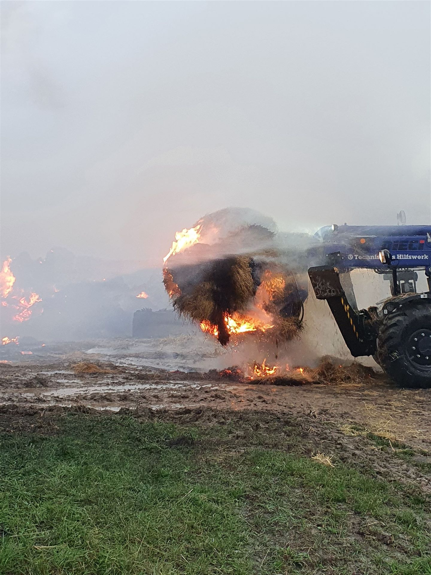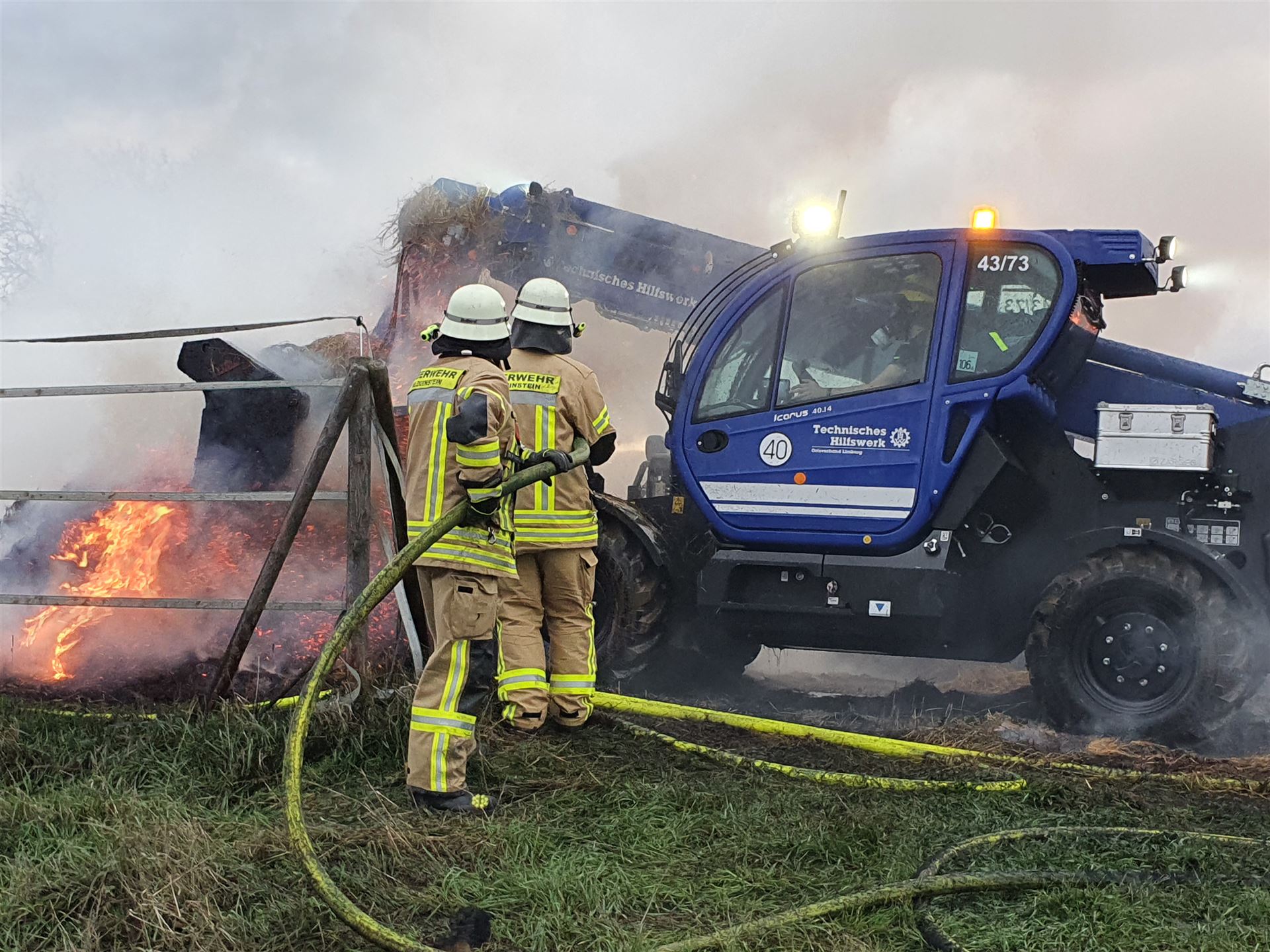 Die brennenden Heuballen wurden mit einem Radlader des THW auseinander gezogen.