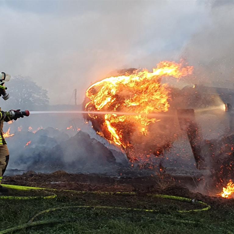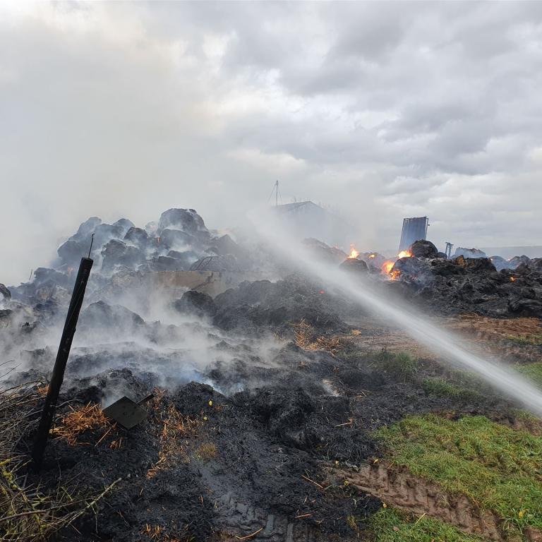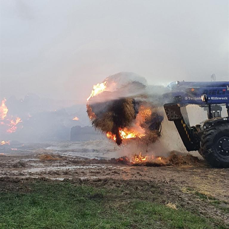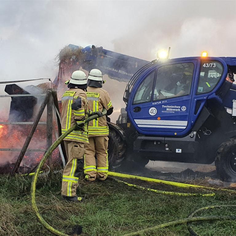 Die brennenden Heuballen wurden mit einem Radlader des THW auseinander gezogen.