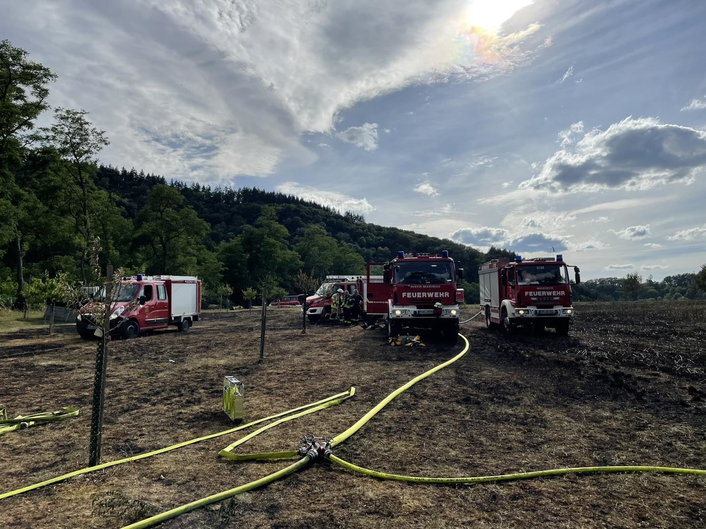 Nachdem Landwirte durch Umgraben der Feldränder den Brand eingedämmt hatten, unterstützten wir mit unserem Fahrzeug bei den Nachlöscharbeiten.