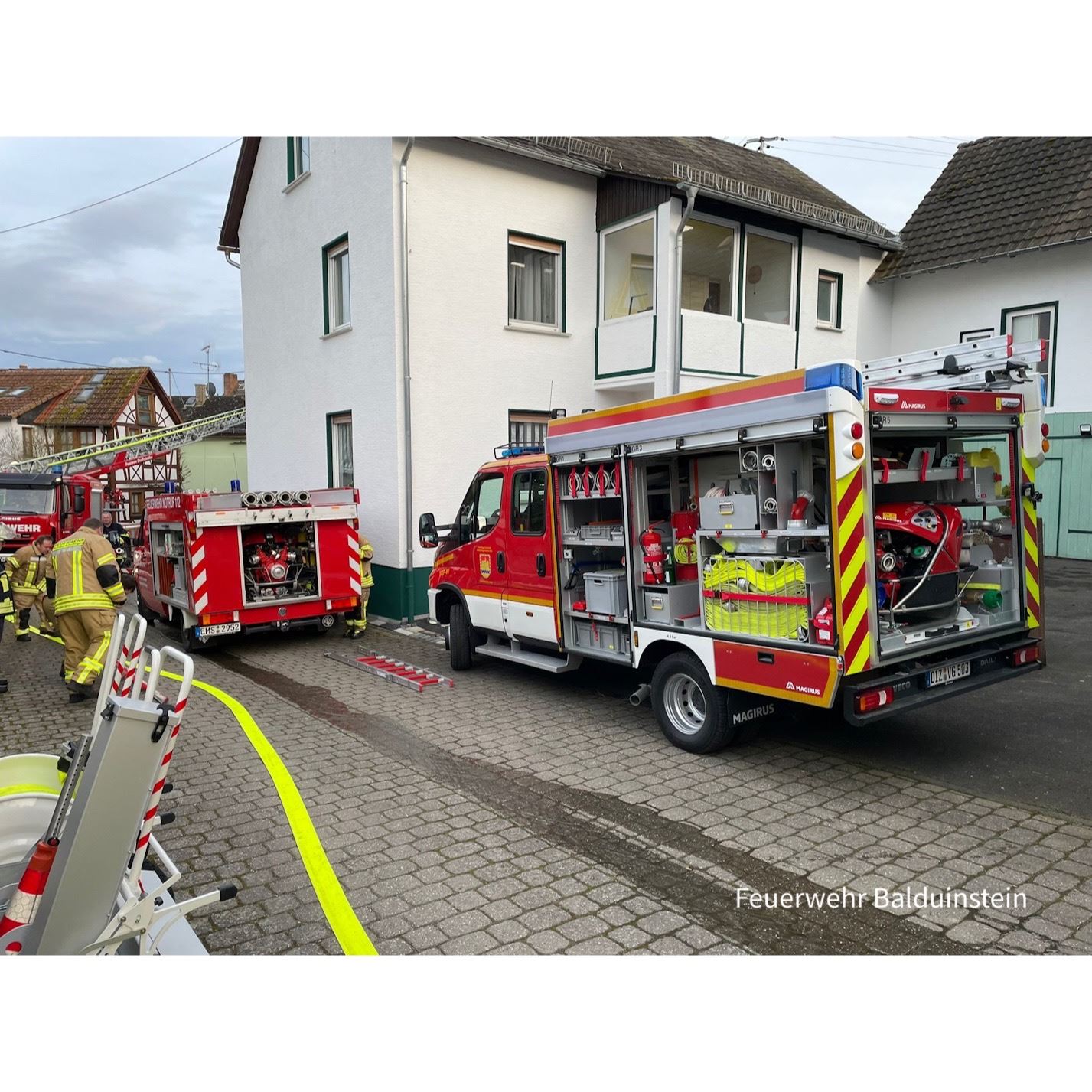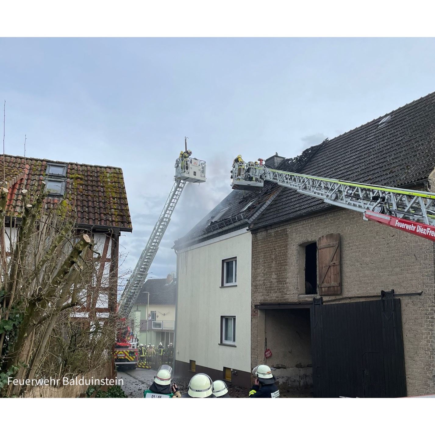 Mit Hilfe von mehreren Trupps unter Atemschutz im Innenangriff und den Drehleitern aus Diez und Holzappel konnte das Feuer schließlich gelöscht werden. Leider entstand hoher Schaden an dem Gebäude.