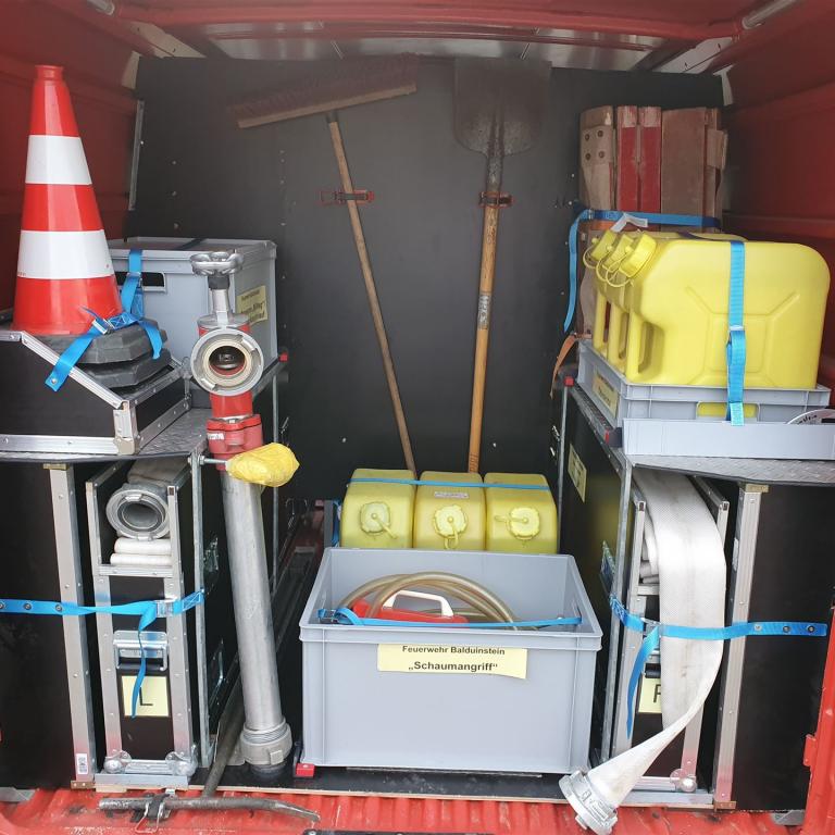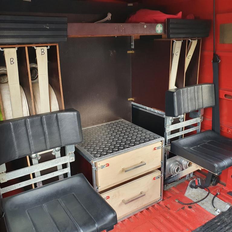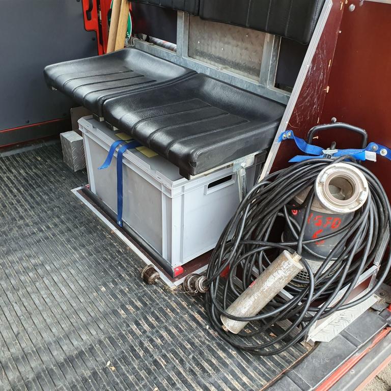 Auch der Innenraum wurde umgebaut und umgestaltet: So konnten neben den Einsatzkräften auch Schlauchreserve, Tauchpumpe und Schaumausrüstung sicher transportiert werden.
