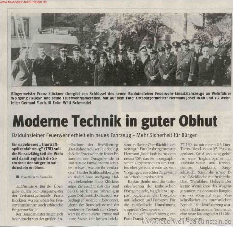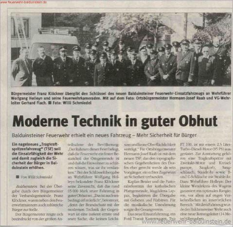 Am 07.10.1997 wurde der Balduinsteiner Wehr das sich momentan im Dienst befindende TSF im Rahmen des Oktoberfestes feierlich übergeben. Der rund 65.000 DM teure Ford Transit Kastenwagen; Typ FT 190, ist mit einem 2,5 Liter Turbo Diesel Motor ausgerüstet.
