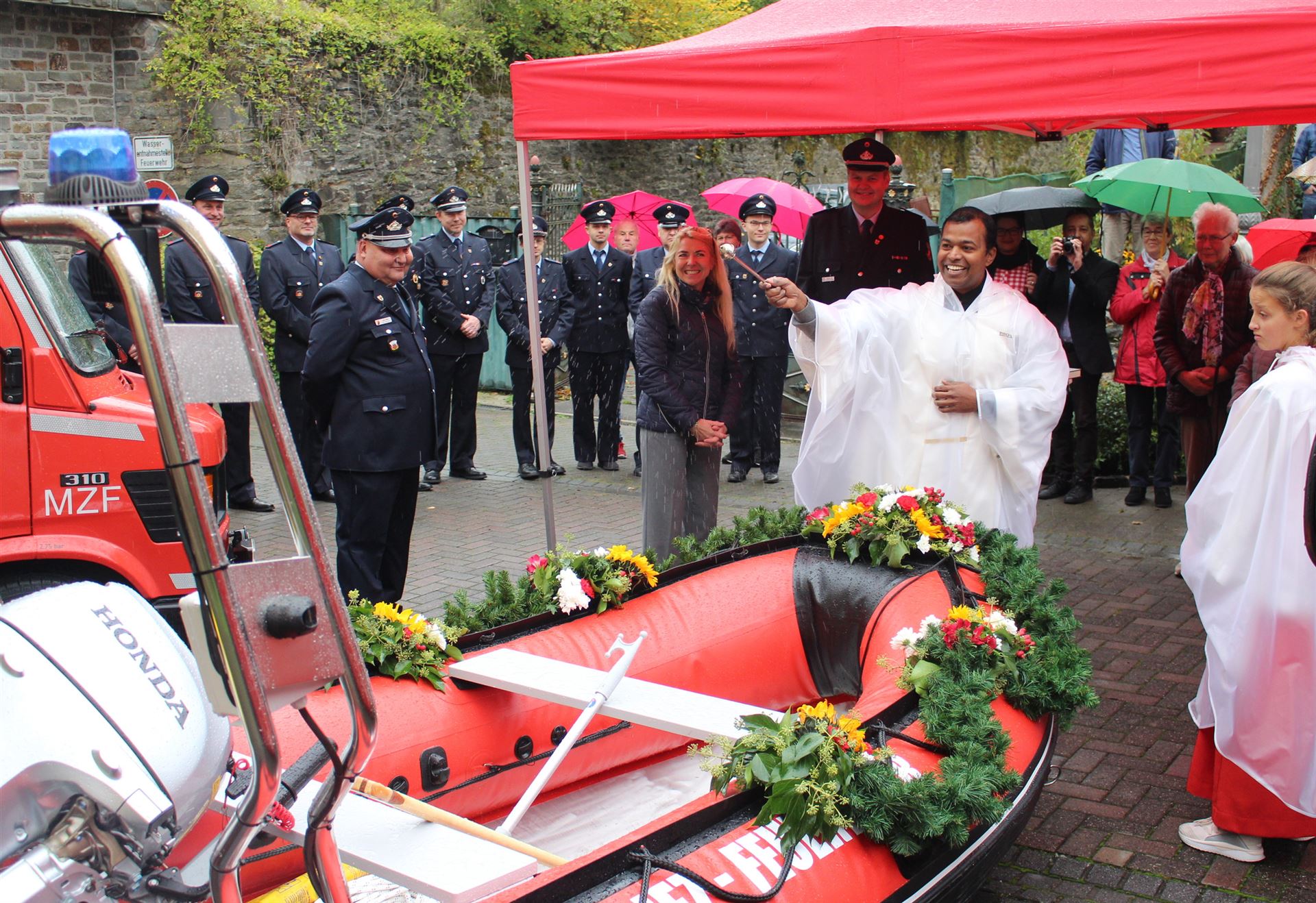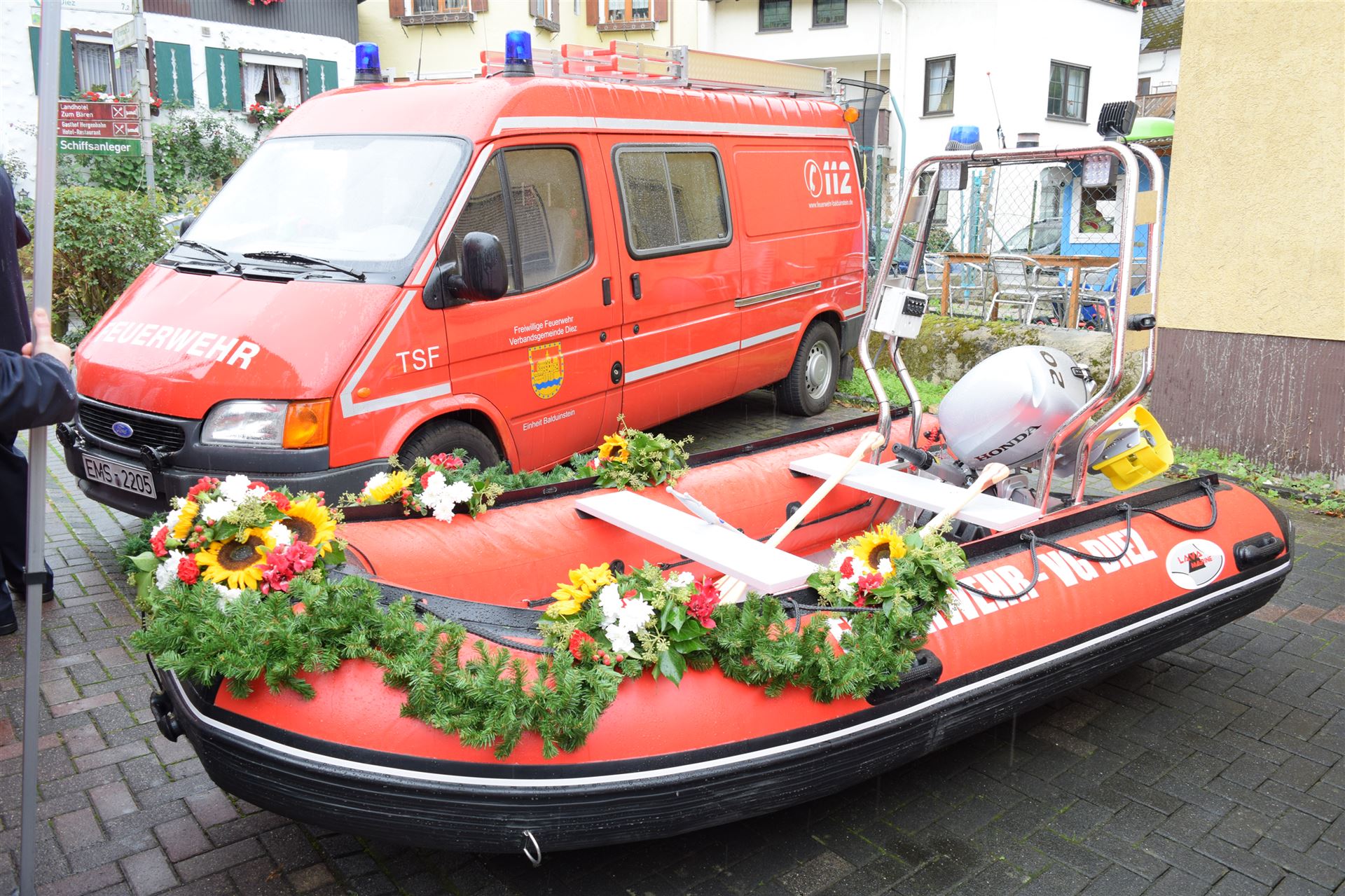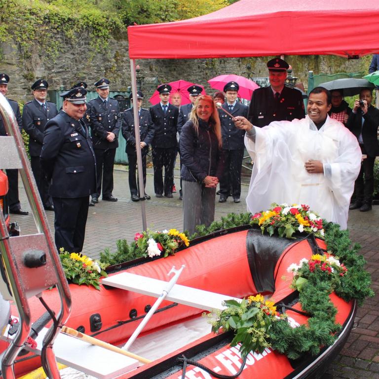 Statt eines bei Fahrzeugübergaben üblichen symbolischen Schlüssels überreichte sie dem Wehrführer Markus Stock zur offiziellen Übergabe und Indienststellung des neuen Bootes ein Paddel. Pfarrer John segnete Boot, Feuerwehr und Gäste.