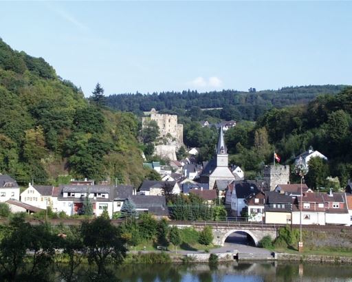 Balduinstein ist ein geschichtsträchtiger Ort. Mit dem Jahre 1319 trat der Ort ins Rampenlicht der Geschichte. Der Kurfürst Balduin von Trier. Bekannt auch als Balduin von Luxemburg, begann mit dem Bau einer Burg auf dem mächtigen Kalkfelsen über dem Tal des Holzbaches, mitten auf fremden Grund und Boden. Seine Absicht war es, die Herren von Westerburg auf der nahen Schaumburg zu kontrollieren. In relativ kurzer Zeit entstand so eine Burg in einem neuen Baustil, ohne Turm, aber mit besonders dicken und starken Mauern – einmalig in Deutschland und anderenorts nie wieder gebaut. Die Burg bestand zunächst aus einem mehrstöckigen Pallas = Palast, also Wohnraum und einem schmalen Burghof. Er lag auf der Westseite des Felsens. Ein Graben umgab den Fels, zum teil durchflossen vom Bach.